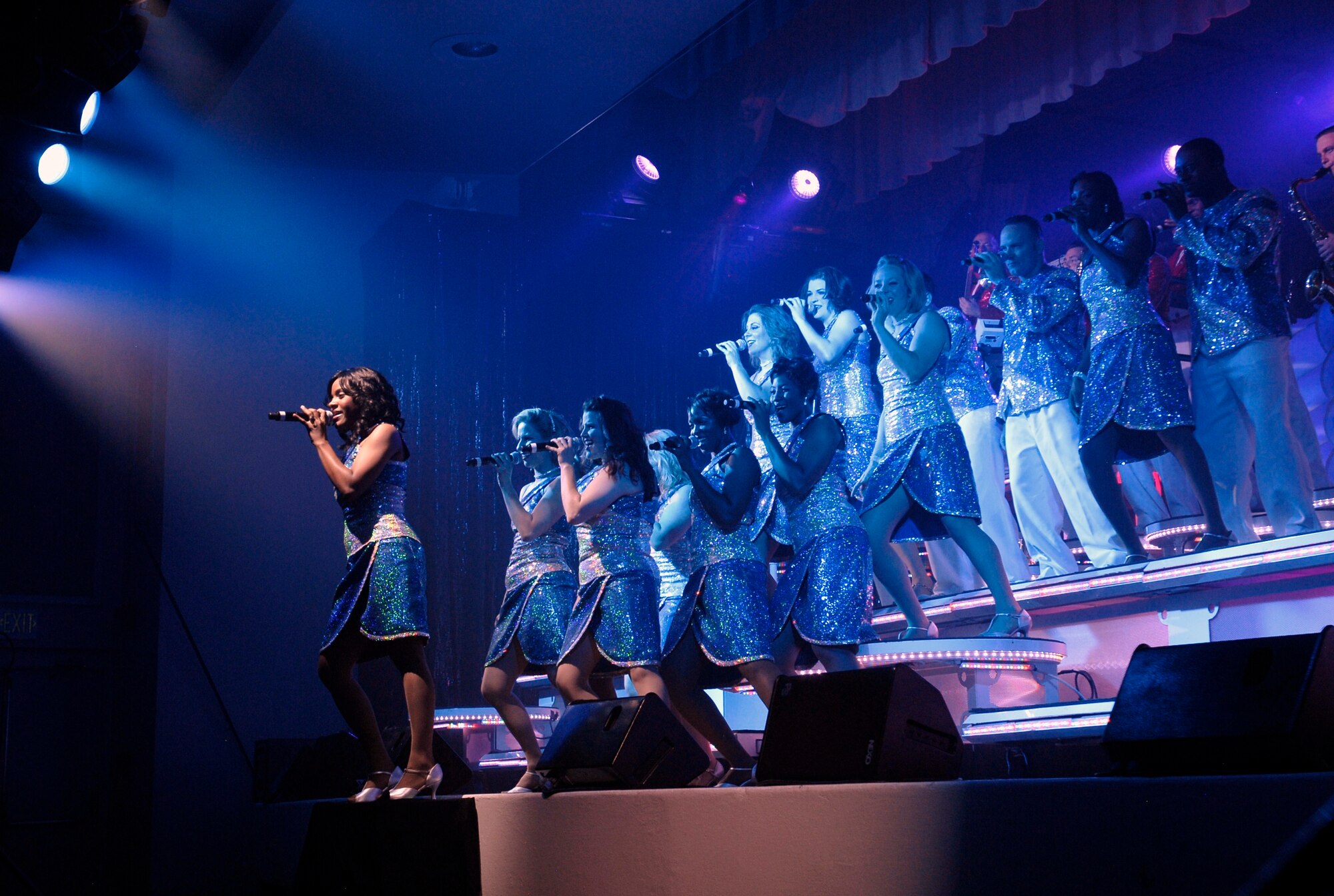 Airman 1st Class Jamie Horner, vocalist with Tops in Blue from the 316th Civil Engineer Squadron, Andrews Air Force Base, Md., performs at Peterson Air Force Base auditorium Aug. 20. To date, Tops in Blue has traveled more than four million miles to military bases throughout the world, performed at six World Fairs, more than 100 state fairs and festivals, and performed at countless air shows, military balls and special events. (Air Force photo/Airman 1st Class Jessica Hines)