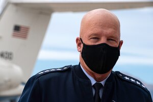 Chief of Space Operations General John W. "Jay" Raymond poses for a portrait after landing at Peterson Air Force Base, Oct. 20, 2020. Raymond visited Peterson AFB to preside over the Space Operations Command stand-up Oct. 21, 2020. (U.S. Space Force photo by Staff Sgt. Jared Bunn)