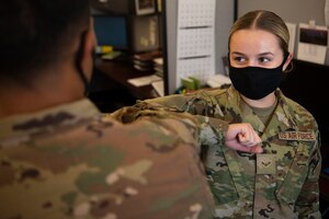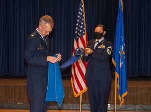 Col. Patrick Pohle, 21st Medical Group commander, left, unsheathes the guidon to activate the 21st Dental Squadron, Sept. 10, 2020 at Peterson Air Force Base. In July of 2019, the Dental Squadron was deactivated and reorganized into the 21st Operational Medical Readiness Squadron in an effort to