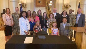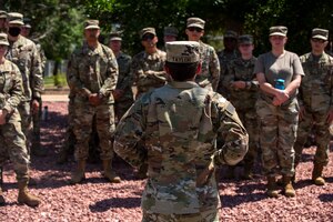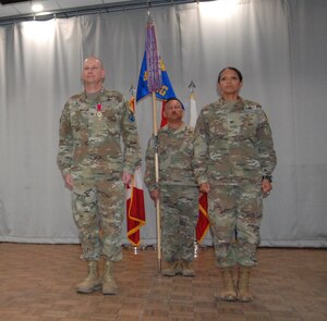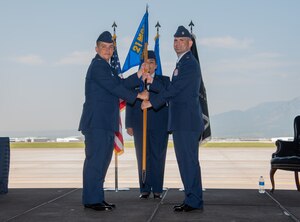 U.S. Air Force Col. David Wilson, 21st Mission Support Group commander, presents U.S. Air Force Lt Col. Heath McKim, 21st Force Support Squadron incoming commander, with the squadron guidon during a change of command ceremony at Peterson Air Force Base, Colorado, July 21, 2021. The passing of the