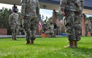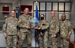 Members of the 21st Security Forces Squadron receive the 2020 U.S. Space Force Best Large Unit Award at Peterson Air Force Base, Colorado, May 17, 2021. From left, U.S. Air Force Col. Theodore Breuker, Space Operations Command Security Forces division chief; U.S. Air Force Lt. Col. Rob Johnson, 21st