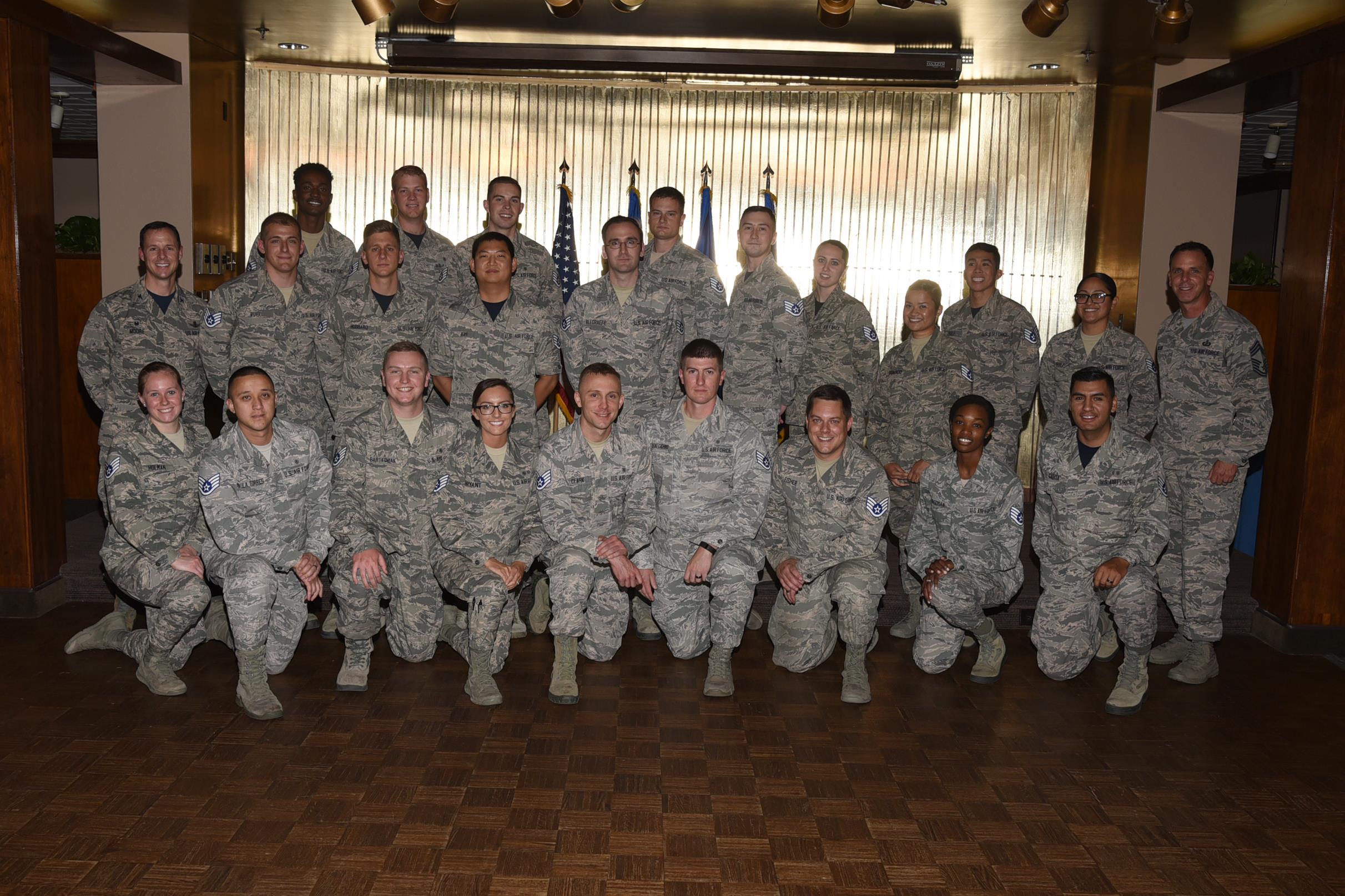 Col. Todd Moore, 21st Space Wing commander, and Chief Master Sgt. Marcus Webb, 21st Contracting Squadron superintendent, stand in company with staff sergeant selects Jason Moran and Garrett Thompson from Space and Missile Systems Center during a promotion release party at The Club on Peterson Air Force Base, Colo., Aug. 25, 2017. (U.S. Air Force photo by Robb Lingley)