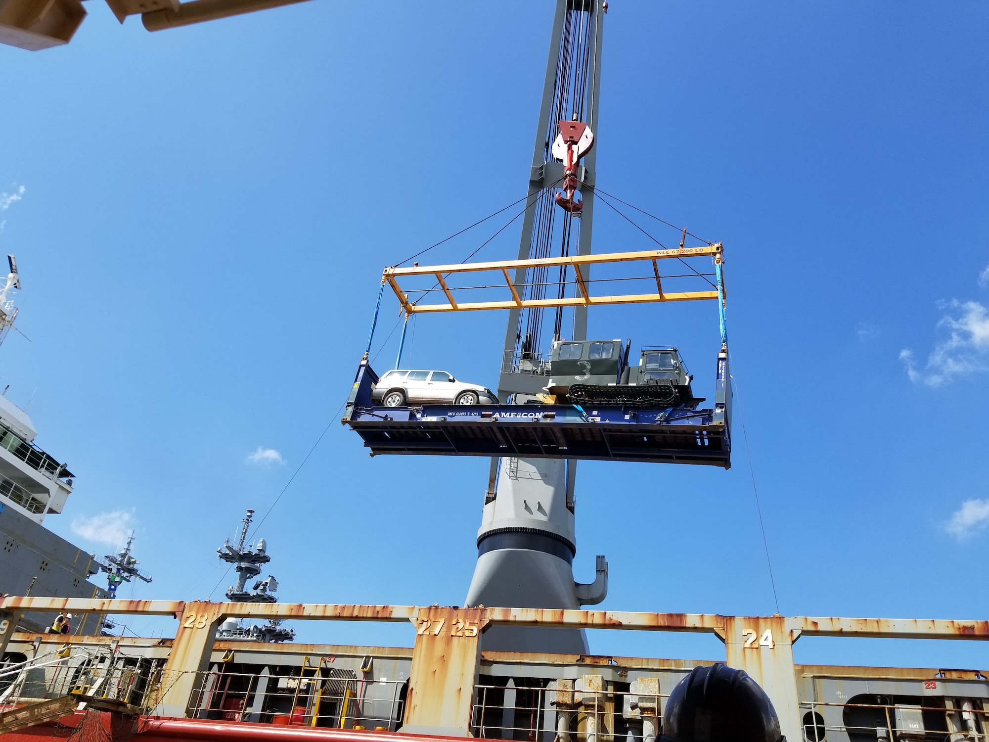 It’s not as simple as loading some boxes, says Isai Vazquez, marine cargo specialist for DLA Distribution Norfolk. “Required items can vary greatly in size, so we also need to determine the equipment needed to lift those items onto the ship. This year we onloaded a 68,000 lb. Aircraft loader a 35,000 lb. Air Force fire truck, among other items.”