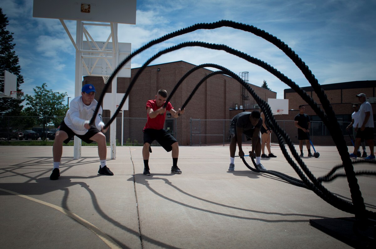 PETERSON AIR FORCE BASE, Colo. – (From left) Staff Sgt. Julieth Collazos, 21st Dental Squadron, Robert Ewers, 27th Special Operations Force Support Squadron, and Capt. Anthony Hemphill, U.S. Air Force Academy, practice the accelerator bear crawl outside the Fitness Center at Peterson Air Force Base, Colorado, as part of the Alpha Warrior training, July 19, 2018. Participants came from Peterson AFB, Schriever AFB, Buckley AFB, Fort Carson, Cannon AFB and other bases to become certified Alpha Warrior trainers. (U.S. Air Force photo by Audrey Jensen)