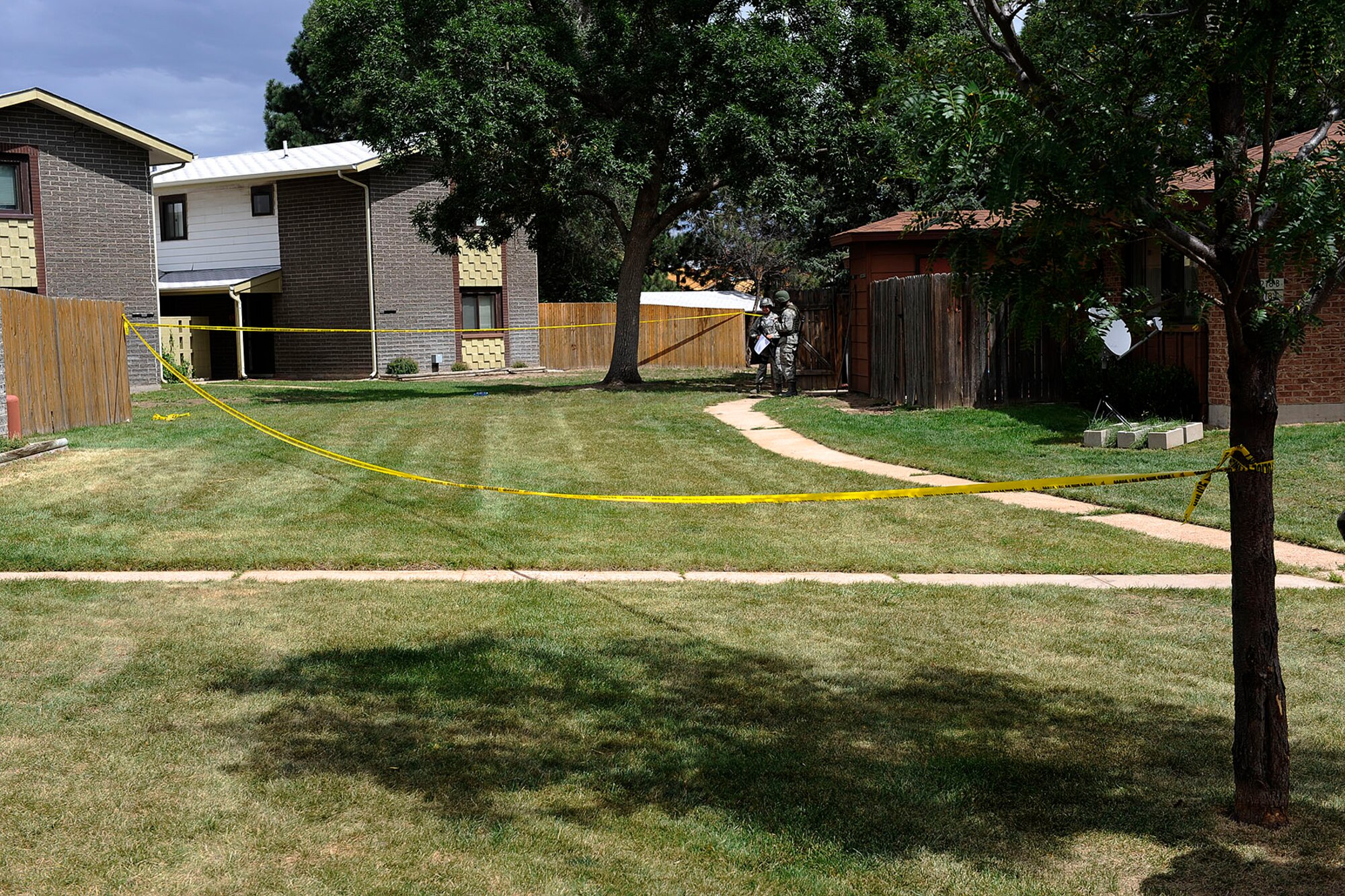 Staff Sgt. Benjamin Baird, 21st Security Forces Squadron, apprehends a suspect in an active shooter scenario during the quarterly Condor Crest exercise on Peterson Air Force Base Aug. 16 to 20. The scenario played out in front of the Forest L. Vosler NCO Academy and several nearby buildings went into lockdown mode. The exercise is an opportunity for security forces to practice responses to an active shooter on base, a real life incident that occurred at Fort Hood, Texas, in November 2009. (U.S. Air Force photo/Dennis Howk)