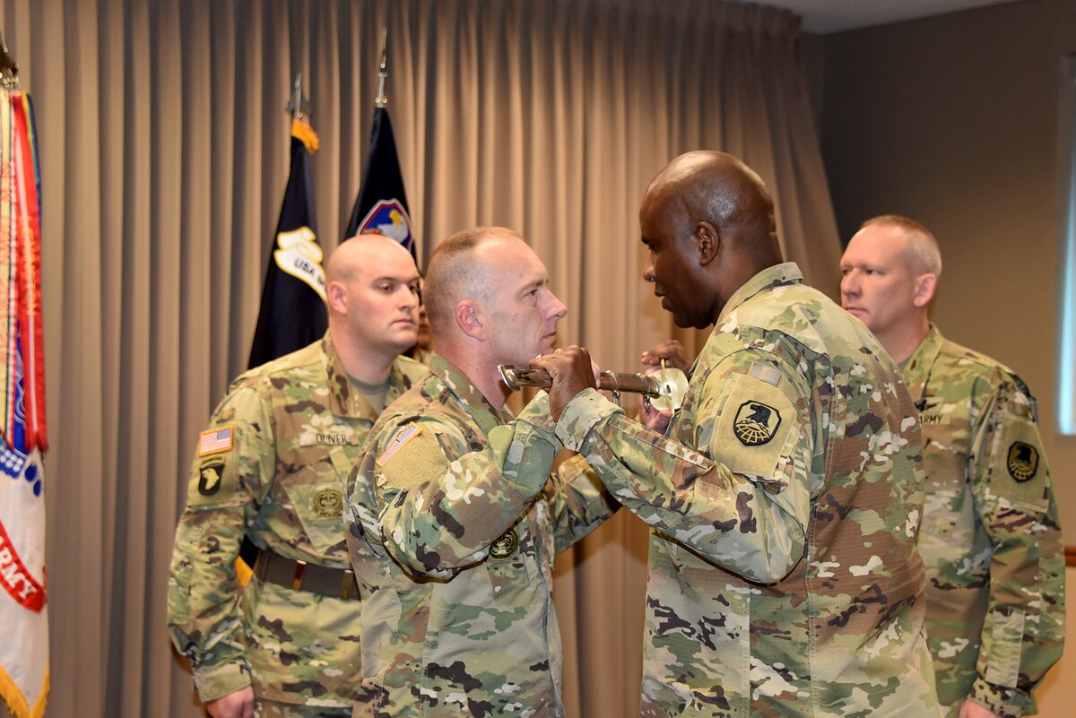 PETERSON AIR FORCE BASE, Colo. - U.S. Army Space and Missile Defense Command and Army Forces Strategic Command's incoming Headquarters and Headquarters Company first sergeant Cody Dorman accepts the noncommissioned officer's sword from Command Sgt. Maj. Jerome Wiggins, SMDC's command sergeant major, during the HHC Change of Responsibility ceremony at SMDC's Peterson Air Force Base, Colorado, headquarters, Sept. 8, 2016. (U.S. Army photo by Dottie White)