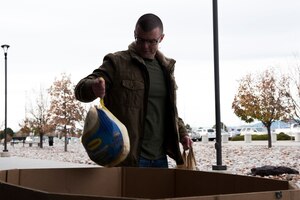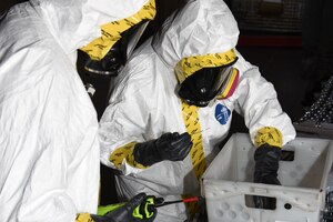 PETERSON AIR FORCE BASE, Colo. - (From left to right) Col. Sam Johnson, 21st Space Wing vice commander, and Maj. Gen. John Shaw, Air Force Space Command deputy commander, greet Defense Secretary James Mattis on the fight line at Peterson Air Force Base, Colo., Nov. 30, 2018. Mattis was in Colorado